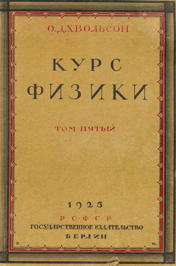 Курс физики : в 5 т. Т. 5 : Учение о магнитных и электрических явлениях (вторая половина) / О. Д. Хвольсон. - Изд. 2-е. - Берлин : Напечатано Гос. Изд-вом по договору с Изд-вом З. И. Гржебина, 1923. - 983 с. : ил. - Библиогр.: с. 952-953 и в конце глав. - Указатели : с. 954-976. - Экслибрис РСФСР Государственное издательство.