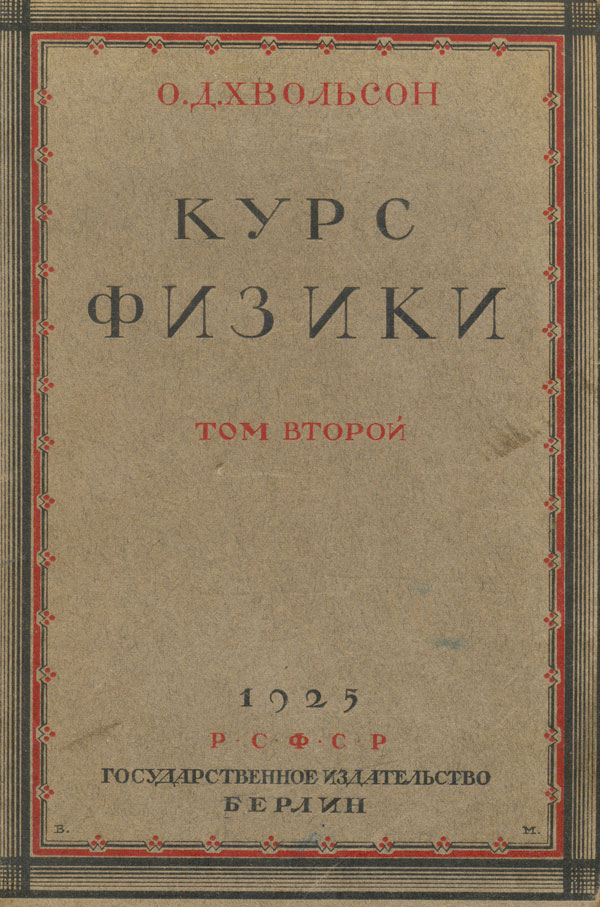 Курс физики : в 5 т. Т. 2 : Учение о звуке (акустика). - Учение о лучистой энергии / О. Д. Хвольсон. - Изд. 5-е, перераб. и значительно доп. - Берлин : Напечатано Гос. Изд-вом по договору с Изд-вом З. И. Гржебина, 1925. - 775 с. : ил. - Библиогр. в конце глав. - Указатели : с. 750-767.