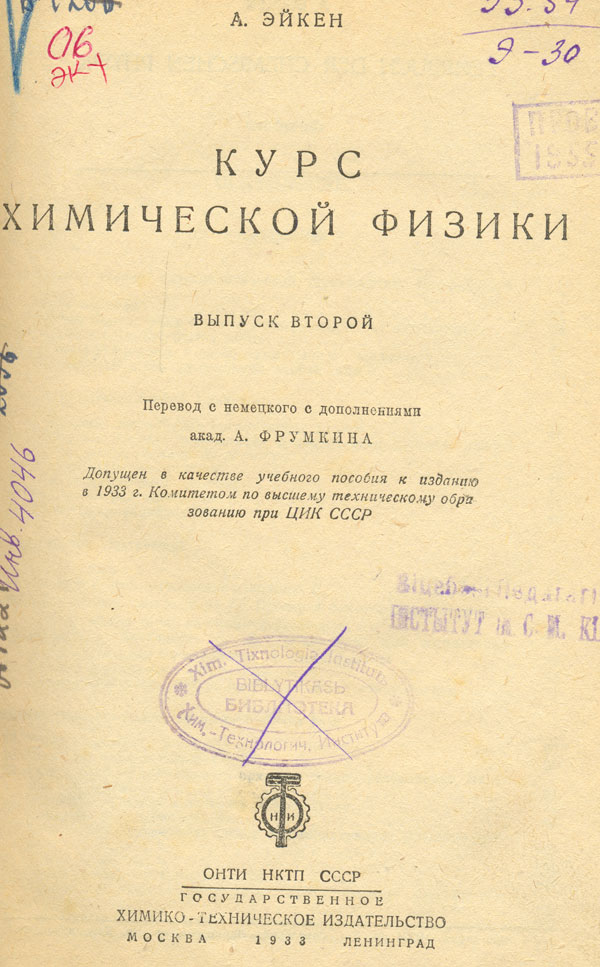 Курс химической физики : учеб. пособие . Вып. 2 / А. Эйкен ; пер. с нем. с доп. А. Фрумкина. - Москва ; Ленинград : ОНТИ НКТП СССР, Гос. химико-технич. изд-во, 1933. - 210 с. - Библиогр. в обл. ссылок.