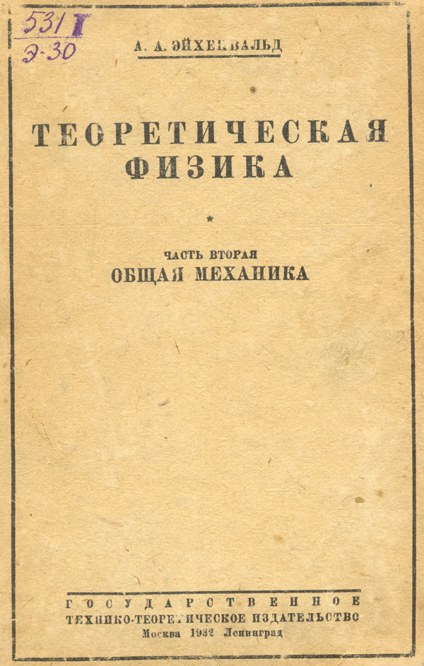 Теоретическая физика. Ч. 2 : Общая механика / А. А. Эйхенвальд. - Изд. 2-е. - Москва ; Ленинград : Гос. технико-теоретич. изд-во, 1932. - 328 с. - Библиогр.: с. 322-323. - Алф. указ.: с. 324-325.