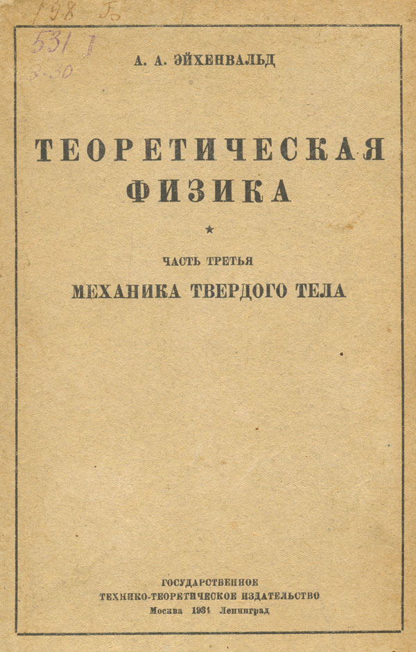 Теоретическая физика. Ч. 3 : Механика твердого тела / А. А. Эйхенвальд. - Изд. 2-е. - Москва ; Ленинград : Гос. технико-теоретич. изд-во, 1934. - 220 с. - Библиогр.: с. 219. - Алф. указ.: с. 220.
