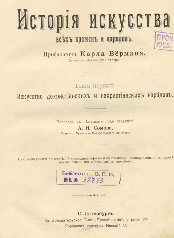 Исторiя искусства всех времен и народов. Т. 1 : Искусство дохристiанских и нехристiанских народов / К. Вёрман ; перевод с немецкаго под редакцiей А. И. Сомова, старшего хранителя Императорскаго Эрмитажа. - С.-Петербург : Книгоиздательское Т-во "Просвещенiе", [1903?]. - XXI, 832 с. : ил., [36] вкл. ил., [17] вкл. цв. ил. - Библиогр.: с. 801-817. - Алф. указ.: с. 818-827.