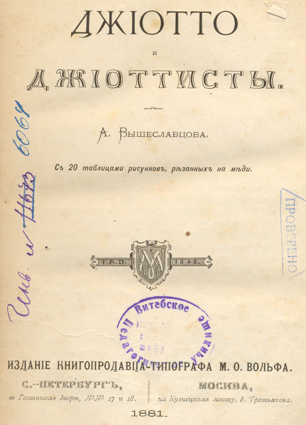 Джiотто и джiоттисты / А. Вышеславцов. - С.-Петербург ; Москва : Изданiе книгопродавца-типографа М. О. Вольфа, 1881. - XXXIX, 305 с., [19] вкл. л. Сигла хранения: фрк Введение Оглавление