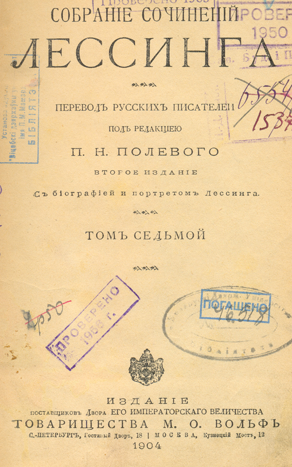 Собранiе сочиненiй : с бiографiей и портретом Лессинга. Т. 7 / Лессинг ; перевод русских писателей под редакцiею П. Н. Полевого. - Второе изданiе . - С.-Петербург ; Москва : Изданіе ... Товарищества М. О. Вольф, 1904. - 203 с. - Библиогр. в обл. ссылок.