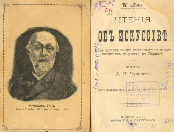 Чтенiя об искусстве : пять курсов лекцiй, читанных в школе изящных искусств в Париже / И. Тэн ; перевод А. Н. Чудинова. - Пятое исправленное изданiе. - С.-Петербург : Изданiе В. И. Губинскаго, 1904. - 416 с., портр. - Библиогр. в обл. ссылок.