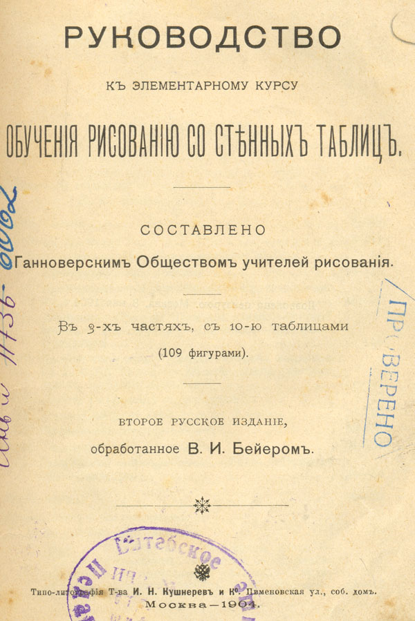 Руководство к элементарному курсу обученiя рисованiю со стенных таблиц : в 3-х частях / составлено Ганноверским Обществом учителей рисованiя : изданiе, обработанное В. И. Бейером. - Второе русское изданiе. - Москва : Типо-литографiя Т-ва И. Н. Кушнерев и К., 1904. - VII, 126 с.