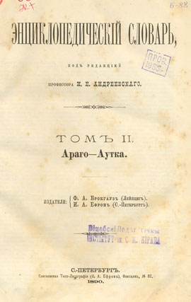 Энциклопедическiй словарь,.Т. 2 : Араго - Аутка / под ред. И. Е. Андреевскаго. - Санкт-Петербург : Изд. Ф. А. Брокгауз (Лейпциг), И. А. Ефрон (С-Петербург), 1890 (Семеновская Типо-Литографiя (И. А. Ефрона)). - 478 с., [13] вкл. л. ил., [2] вкл. цв. карт. - Библиогр. в конце ст. - На корешке переплета Т. 3.