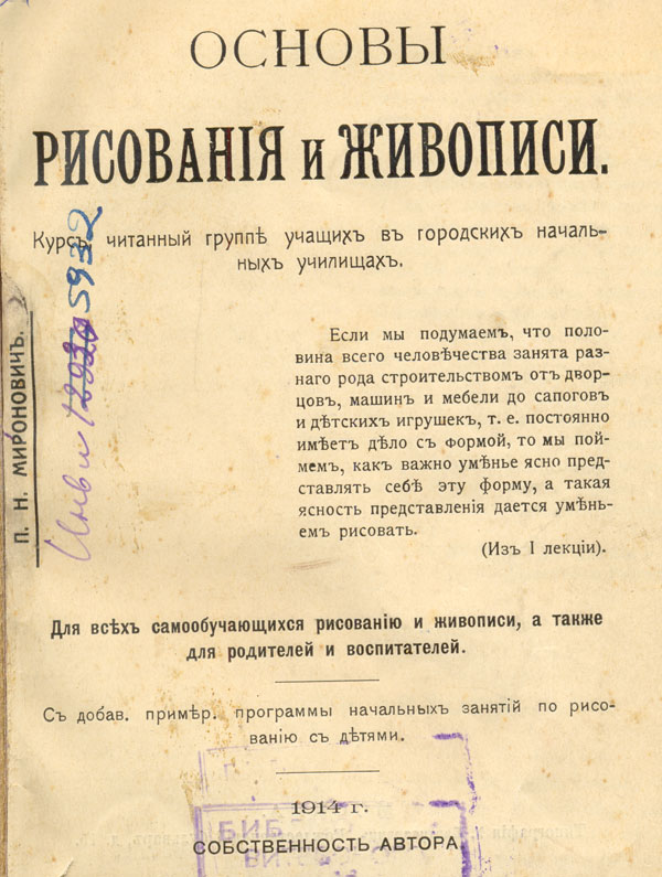 Основы рисованiя и живописи : курс читанный группе учащих в городских начальных училищах : для всех самообучающихся рисованiю и живописи, а также для родителей и воспитателей. С добав. пример. программы начальных занятiй по рисованiю с детями / П. Н. Миронович. - Москва : Собственность автора : [Типографiя Х. Бархударянц] , 1914. - 112 c. : ил.