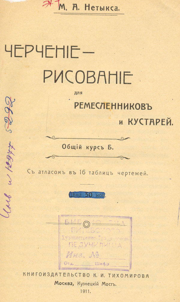 Черченiе - рисованiе для ремесленников и кустарей : общiй курс Б. / М. А. Нетыкса. - Москва : Книгоиздательство К. И. Тихомирова, 1911. - 48 с. : ил. + 16 табл. (прилож.).