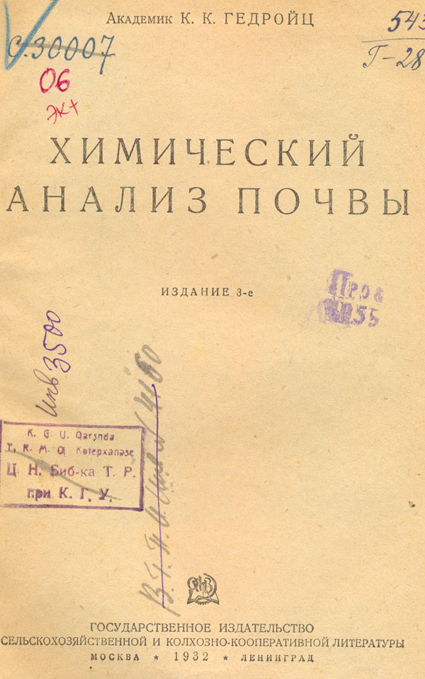 Химический анализ почвы / К. К. Гедройц. - Изд. 3-е. - Москва ; Ленинград : Сельколхозгиз, 1932. - 536 с. : портр., ил. - Библиогр. в обл. ссылок.