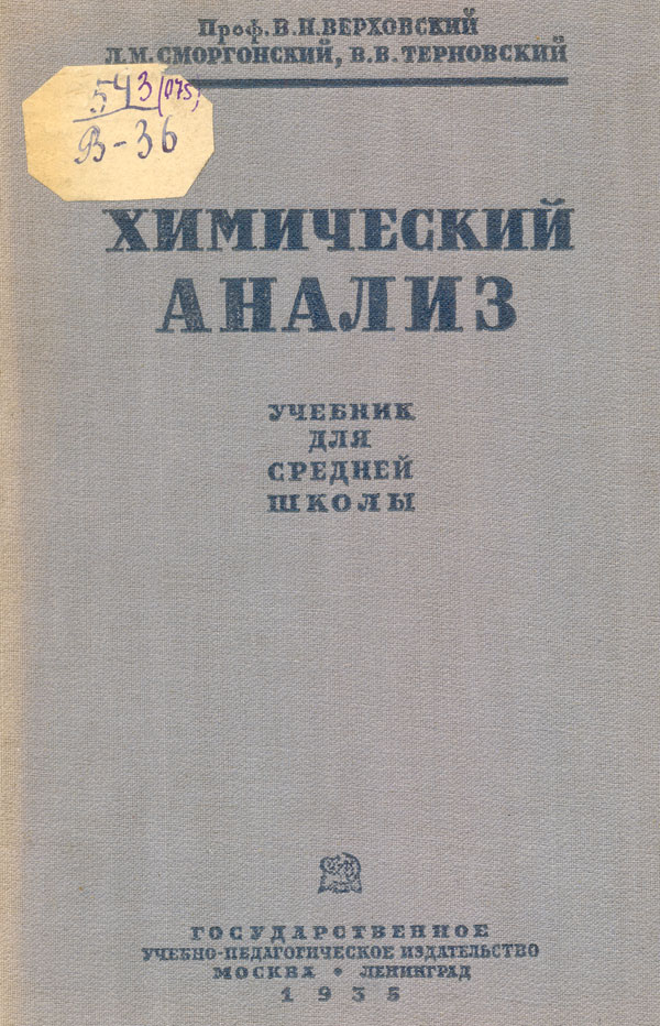 Химический анализ : учебник для 10-го класса средней школы / В. Н. Верховский, Л. М. Сморгонский, В. В. Терновский. - Москва ; Ленинград : Учпедгиз, 1935. - 88 с.