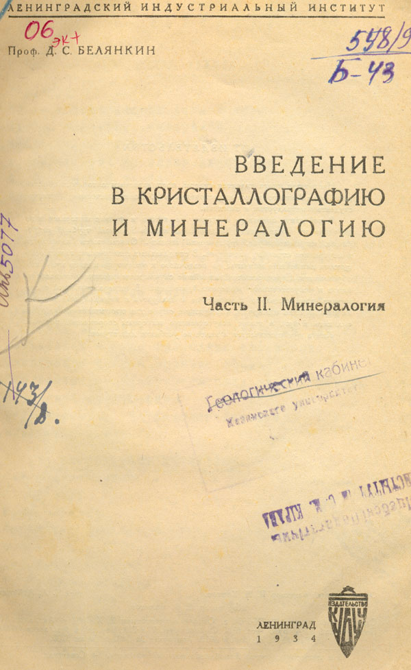 Введение в кристаллографию и минералогию. Ч. 2 : Минералогия / Д. С. Белянкин ; Ленинградский индустриальный ин-т. - Ленинград : КУБУЧ, 1934. - 184 с. : [5] вкл. л.