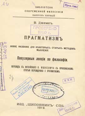 Прагматизм. Новое названіе для некоторых старых методов мышленія: популярныя лекцiи по философiи / перевод с англiйскаго П. Юшкевича с приложенiем статьи переводчика о прагматизме. - СПБ.: Шиповник, 1910. - 244 с. - (Библiотека современной философiи; Вып. 1).