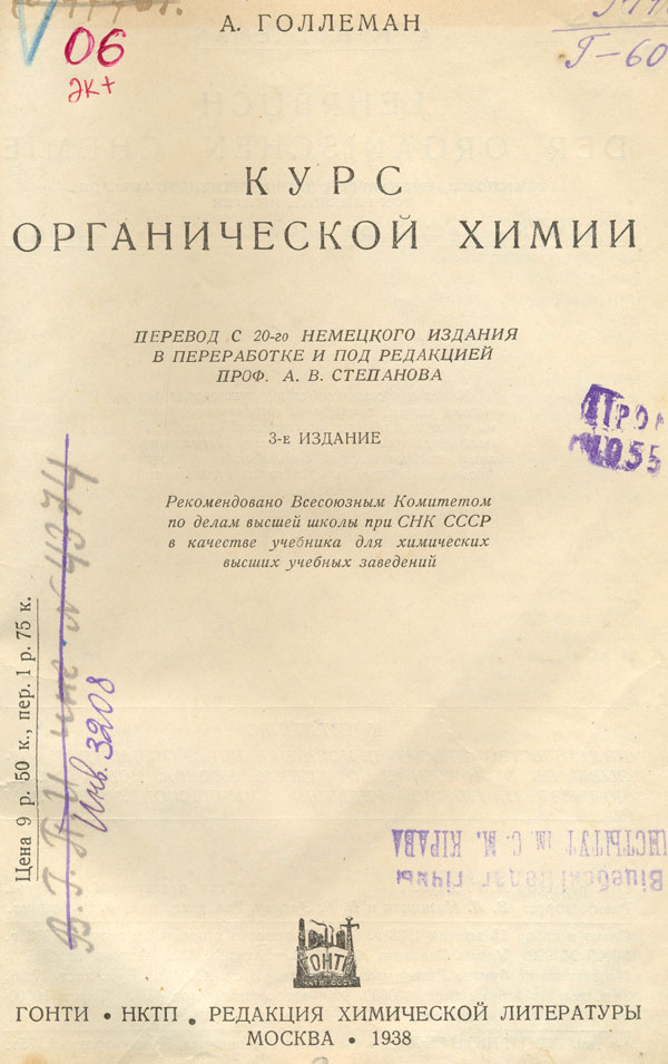 Курс органической химии : учебник для химических вузов / А. Голлеман ; пер. с 20-го нем. изд. в перераб. и под ред. А. В. Степанова. - 3-е изд. - Москва : ГОНТИ НКТП, Ред. хим. лит., 1938. - 552 с. - Указатели : с. 534-552. -Загл парал. рус., нем. на обороте тит. л.