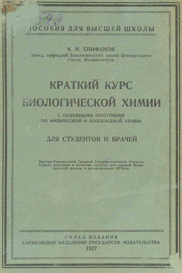 Краткий курс биологической химии с основными понятиями по физической и коллоидной химии : для студентов и врачей ; пособие для высшей Мед. школы и ветеринарных ВУЗов / К. И. Епифанов ; под ред. И. С. Лобко. - [Саратов] : Склад издания, Саратовское отд. гос. изд-ва, 1927. - 264 с. - (Пособия для высшей школы).