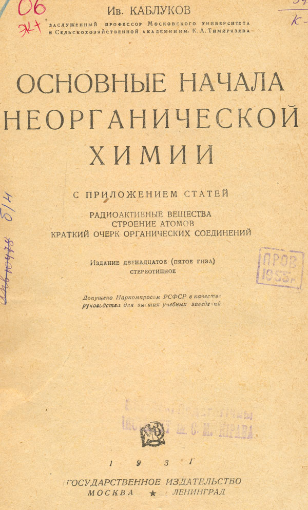 Основные начала неорганической химии : руководство для вузов / И. Каблуков. - Изд. 12-е, стереотип. - Москва ; Ленинград : Гос. изд-во, 1931. - 474 с. - С прилож. статей : Радиоактивные вещества. Строение атомов. Краткий очерк органических соединений. - Предм. указ.: с. 462-474.
