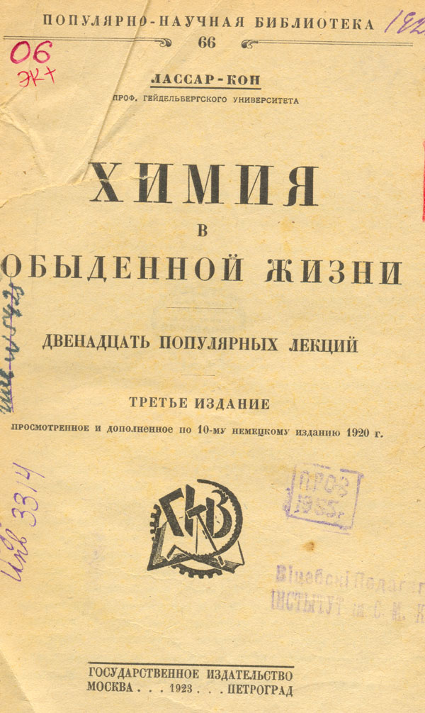 Химия в обыденной жизни : двенадцать популярных лекций / Лассар-Кон . - 3-е изд., просмотр. и доп. по 10-му нем. изд. 1920 г. - Москва ; Петроград : Гос. изд-во, 1923. - 272 с. - (Популярно-научная библиотека ; 66).