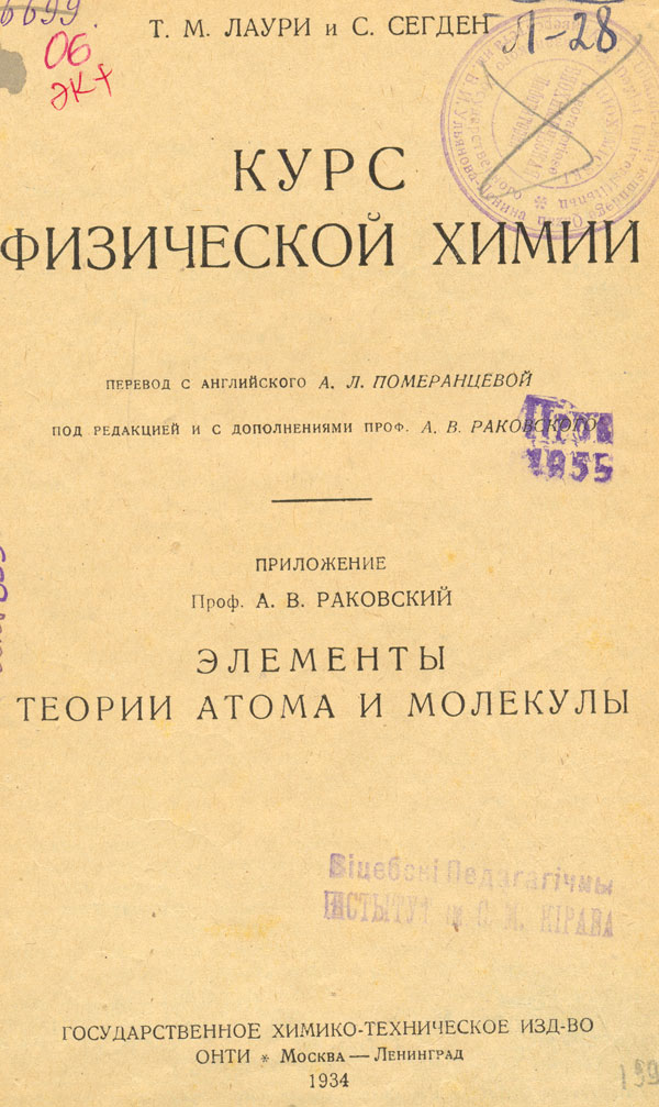 Курс физической химии / Т. М. Лаури, С. Сегден ; пер. с англ. А. Л. Померанцевой ; под ред. и с доп. А. В. Раковского . - Москва ; Ленинград : ОНТИ : Госхимтехиздат, 1934. - 484 с. - Прилож.: А. В. Раковский "Элементы теории атома и молекулы". - Предм. указ.: с. 473-482. - Загл. парал. рус., англ. - На обл. год изд. 1933.