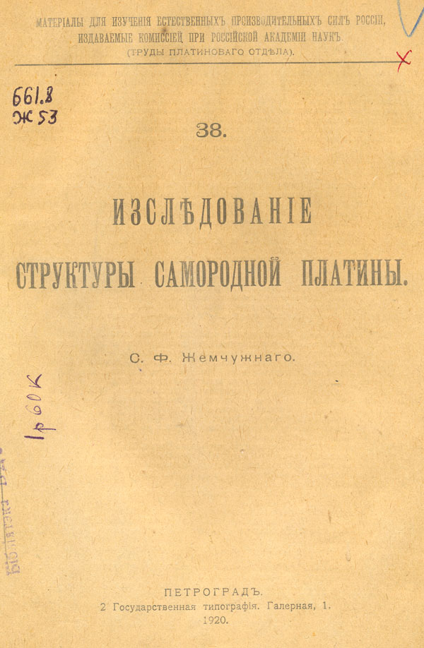 Изследованiе структуры самородной платины. - Петроград : 2 Государственная типографія , 1920. - 44 с. + 3 отд. л. (прилож.). - (Матеріалы для изученiя естественных производительных сил Россiи, издаваемые Комиссiей при Россiйской Академiи наук. (Труды платиноваго отдела) ; Т. 38). - Библиогр. в обл. ссылок.