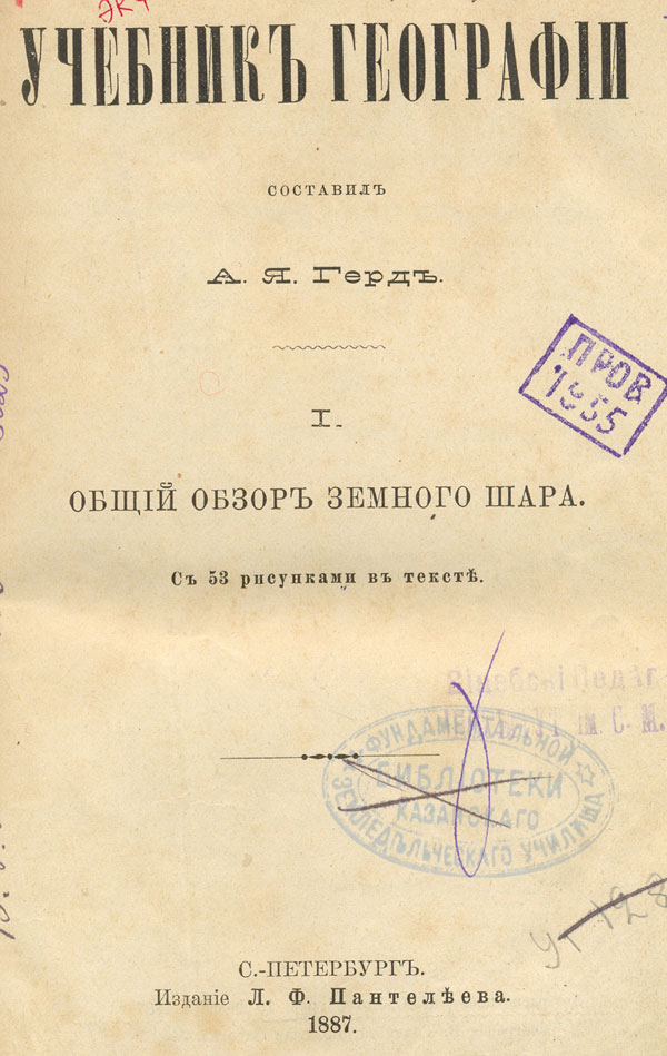 Учебник географiи : [для средних учебных заведенiй]. - С.-Петербург : Изданiе Л. Ф. Пантелеева. - Изд. конволют, состоящий из четырех отдельно изданных томов. - Содерж.: Т. I : Общiй обзор земного шара. -1887. - 99 с.: ил. ; Т. II : Азiя. - 1887. - 98 с.: ил., ; Т. III : Австралiя, Полинезiя, Африка и Америка. - 1888. - 124 с.: ил. ; Т. IV : Европа. - 1889. - 155 с.: ил.