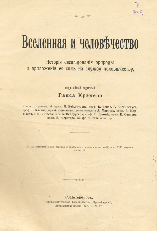 Вселенная и человечество : исторiя изследованiя природы и приложенiя ея сил на службу человечеству . Т. 1 : Общее введеніе. Изследованіе земной коры. Земная кора и ея отношенія к человечеству. Геофизика / перевод с немецкаго под общей редакцiей ...А. С. Догеля, при участiи ...П. И. Броунова, В. И. Палладина, В. М. Шимкевича [и др.] ; свыше 40 художественных приложенiй (цветных и черных иллюстрацiй) и ок. 300 рисунков, исполненных Л. Агассицем, В. Гамильтоном, А. Дрессеном [и др.] / под общей редакцiей Г. Крэмера и при сотрудничестве ...Л. Бейсгаузена, К. Вейле, Г. Вислиценуса [и др.]. - 2-е изданiе со стереотипа. - С.-Петербург : Книгоиздательское Товарищество "Прсвещенiе", [190-?] ( : Типо-литографія Акціонернаго О-ва "Самообразованіе"). - XII, 516 с.