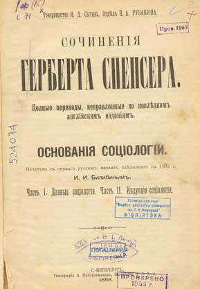 Сочиненія: полные переводы, исправленные по последним англiйским изданiям / печатано с перваго русскаго изданiя, сделаннаго в 1876 г. И. И. Билибиным. - С.-Петербург: Товарищество И. Д. Сытина, Отдел Н. А. Рубакина, 1898 (Типографія А. Пороховщикова). - Изд. конволют без общего тит. л., состоящий из двух отдельно изданных томов. - [Т. 1], ч. 1-2 : Основанiя соцiологiи. - IV, 432 с. ; Т. 2, ч. 3-8 : Основанiя соцiологiи. - IV, 707 с.