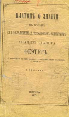 Платон о знанiи в борьбе с сенсуализмом и разсудочным эмпиризмом. Анализ дiалога Феэтета: с примечанiями к тексту дiалога и с предварительными объясненiями к чтенiю его. - Москва: В Университетской Типографiи, 1871. - 134, 234 с. разд. паг.