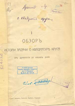 Рудiо.Архимед. Гюйгенс. Ламберт. Лежандр. Ч. 1 : Обзор исторiи задачи о квадратуре круга от древности до наших дней / Рудiо. - Россия, [188-?]. - 98 с. - Библиогр. в обл. ссылок. - Экз. деф.: нет тит. л., нет посл. с., описание составлено по всей книги.rn геометрия, история математики, математикаrnrn