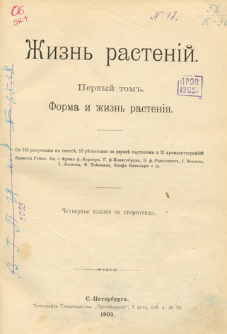Жизнь растенiй : для учительских библiотек тех учебных заведенiй, где преподается естествознанiе : для ученических, старшего возраста, библiотек мужских гимназiй и реальных училищ . Т. 1 : Форма и жизнь растенiя / Кернер фон-Марилаун А. ; перевод со 2-го, вновь переработаннаго и дополненнаго немецкаго изданiя, с библiографическим указателем и оригинальными дополненiями А. Генкеля и В. Траншеля ; под редакцiей ... И. П. Бородина ; ил.: Э. Гейна, А. и Ф. ф.-Кернера, Г. ф.-Кенигсбруна [и др.] . - Четвертое изданiе со стереотипа. - С.-Петербург : Типографiя Товарищества"Просвещенiе", 1903. - XIII, 773 с. : ил. - Экз. деф.: не все ил. сохранены ; в экз. № 3053 нет с. 263-267.