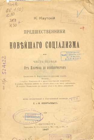 Предшественники новейшаго соціализма. Ч. 1 : От Платона до анабаптистов / предисловiе К. Каутскаго к русскому изданiю ; вновь проверенный и исправленный перевод Е. и И. Леонтьевых. - С.-Петербург, 1907 (Типографія М. М. Стасюлевича). - XII, 389 с. - Библиогр. в обл. ссылок.