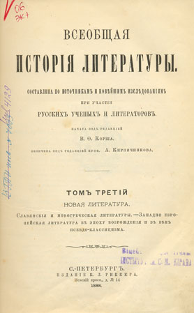 Всеобщая исторiя литературы : составлена по источникам и новейшим изследованiям при участiи русских ученых и литераторов. Т. 3 : Новая литература. Славянскiя и новогреческая литературы. Западно европейская литература в эпоху Возрожденiя и в веке псевдо-классицизма / начата под редакцiей В. Ф. Корша ; продолжается под редакцiей А. Кирпичникова. - С.-Петербург : Изданiе К. Л. Риккера, 1888. - VII, 883 с. - Экз. деф.: нет с. 151-152.
