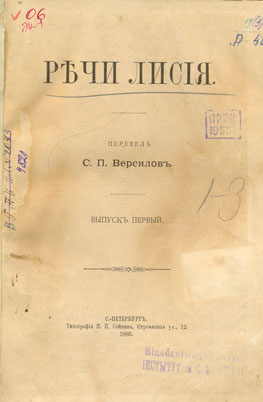 Речи Лисiя / С. П. Версилов ; перевел С. П. Версилов. - С.-Петербург : Типографiя П. П. Сойкина. - 185 с. разд. паг. - Изд. конволют без общ. тит. л., состоящий из трех отдельно изданных выпусков. - Вып. 1. - 1895. - 53 с. ; Вып. 2. - 1896. - 47 с. ; Вып. 3. -1896. - 85 с.