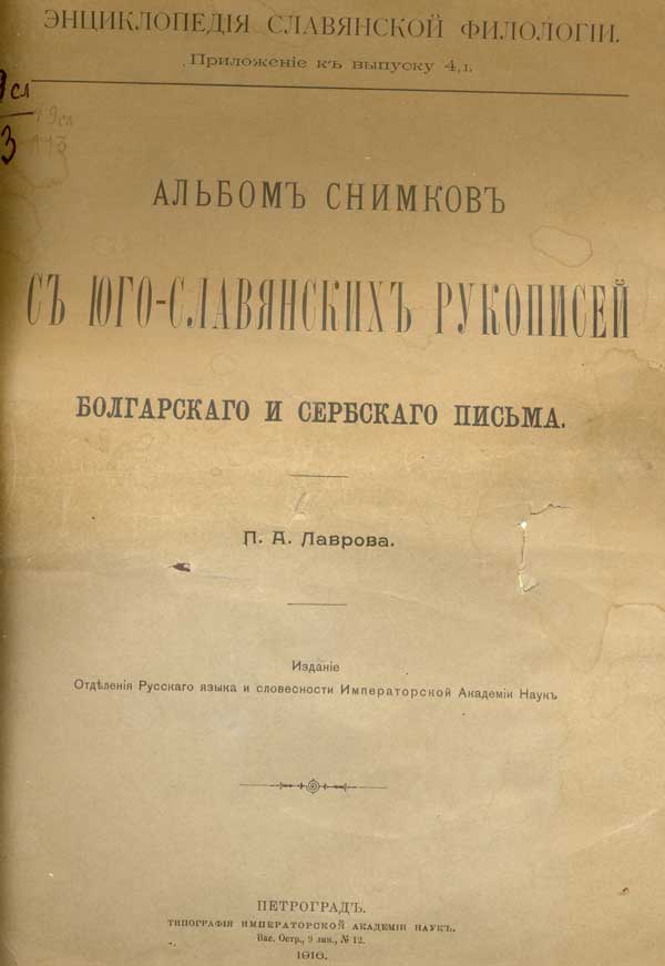 Энциклопедiя славянской филологiи. Приложенiе к выпуску 4,1-4,2 : Альбом снимков с юго-славянских рукописей болгарскаго и сербскаго письма / П. А. Лаврова ; Альбом снимков с кирилловских рукописей румынскаго происхожденiя / Е. Калужняцкаго и А. Соболевскаго / под редакцiею И. В. Ягича. - Петроград : Изданiе Отделенiя Русскаго языка и словесности Императорской Академiи Наук, 1916 ( : Типографiя Императорской Академіи Наук). - 6 с., 130 л.