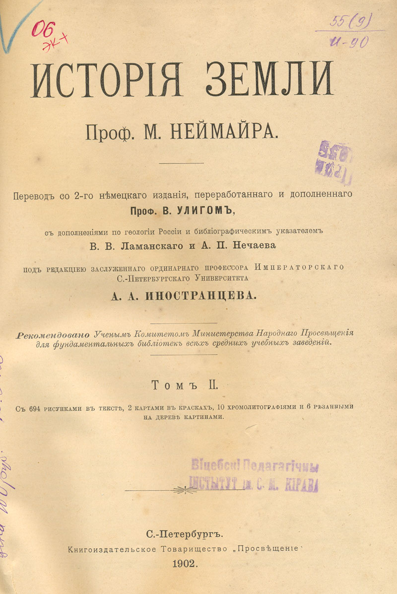 Неймайр, М. .rn Исторiя земли : для фундаментальных библiотек всех средних учебных заведенiй. Том 2 / М. Неймайр ; перевод со 2-го немецкаго изданiя, переработаннаго и дополненнаго проф. В. Улигом, с дополненiями по геологiи Россiи и библiографическим указателем В. В. Ламанскаго и А. П. Нечаева ; под редакцiею заслуженнаго ординарнаго профессора Императорскаго С.-Петербургскаго Университета А. А. Иностранцева . - С.-Петербург : Книгоиздательское Товарищество "Просвещенiе", 1902. - XV, 848 с. : ил., [6] вкл. л., [9] вкл. цв. л., [3] вкл. цв. карты. - Библиогр.: с. 799-807. - Указатели : с. 808-848.rnrn