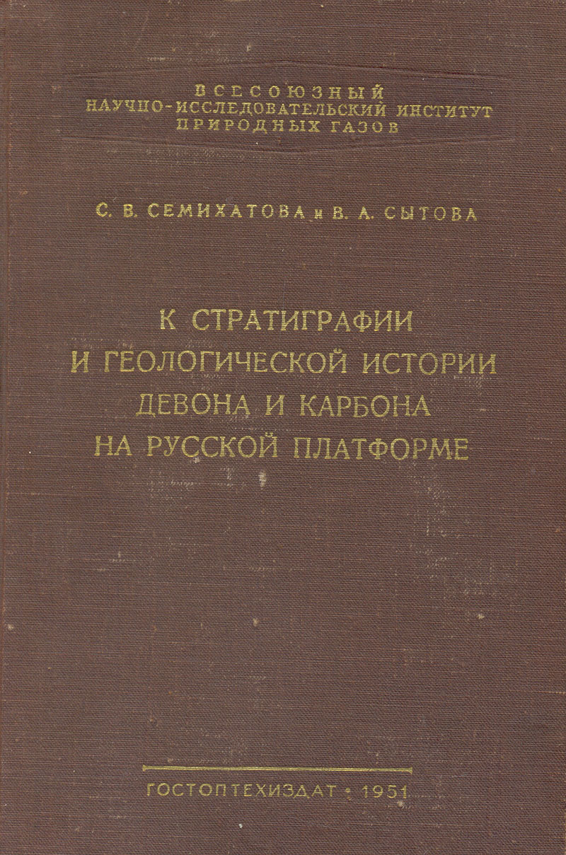 К стратиграфии и геологической истории девона и карбона на русской платформе / С. В. Семихатова, В. А. Сытова ; Всесоюз. научно-исслед. ин-т природных газов. ВНИИГАЗ. - Москва ; Ленинград : Гос. научно-техн. изд-во нефтяной и горно-топливной лит., 1951. - 188 с. + 8 табл. (прилож.). - Библиогр.: с. 179-186.