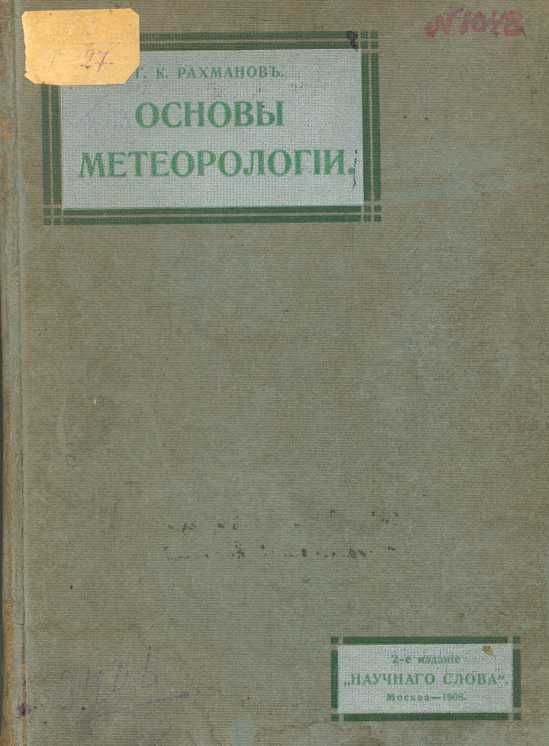 Рахманов, Г. К.rn Основы метеорологiи / Г. К. Рахманов. - 2-е изд. - Москва : Типо-литогр. Т-ва И. Н. Кушнерев и К : Ред. журнала "Научное слово", 1908. - 128 с. : ил. + 6 карт (прилож.).rn