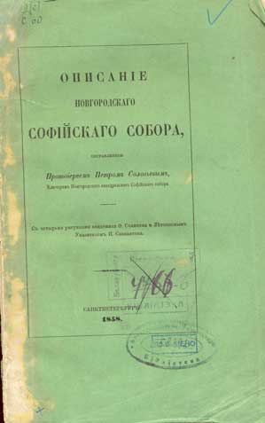 Описанiе Новгородскаго Софiйскаго Собора : с четырьмя рисунками... Ф. Солнцева и Летописным указателем П. Савваитова / составленное Протоіереем П. Соловьевым. - Санктпетербург, 1858 (В типографiи Императорской Академiи Наук). - IV, 244 с. - Библиогр. в обл. ссылок.