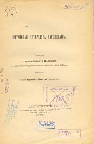 Палладiй (архимандрит). Китайская литература магометан. - Санктпетербург: Издал Iеромонах Николай (Адоратскiй), 1887 (Типографiя Имперторской Академiи Наук). - 334 с. - Библиогр. в обл. ссылок.