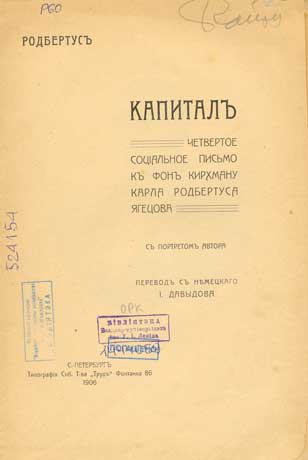 Капитал: четвертое соцiальное письмо к фон Кирхману Карла Родбертуса Ягецова : с портретом автора / перевод с немецкаго I. Давыдова. - С.-Петербург: Книгоиздательство "Начало", 1906 (Типографiя Спб. Т-ва "Труд"). - XI, 208 с.