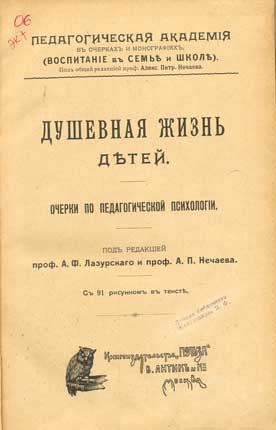 Душевная жизнь детей : очерки по педагогической психологiи : с 91 рисунками в тексте / под ред. А. Ф. Лазурскаго и А. П. Нечаева. - Москва: Книгоиздательство "Польза" : В. Антик и К , 1910. - 283 с. . - (Педагогическая Академiя в очерках и монографiях ; (Воспитанiе в семье и школе) / под общ. ред. А. П. Нечаева). - Библиогр. в обл. ссылок. - На корешке книги : Вып. III.