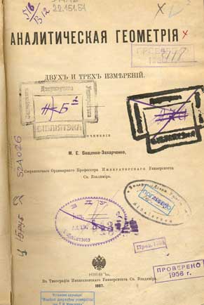 Аналитическая геометрія двух и трех измереній: сочиненіе. - Кіев, 1887 (В типографіи Императорскаго Университета Св. Владиміра). - XXXV, 723 с. - Библиогр. в обл. ссылок.
