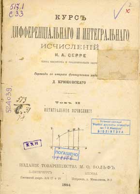 Курс дифференціальнаго и интегральнаго исчисленій. Т. 2 : Интегральное исчисленiе / перевод со втораго французскаго изданiя Д. Крюковскаго. - С.-Петербург ; Москва: Изданіе товарищества М.О. Вольф, 1884. - 648, XII с.