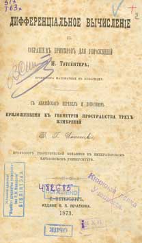 Дифференціальное вычисленіе с собраніем примеров для упражненій / с англiйскаго перевел и дополнил приложенiями к геометрiи пространства трех измеренiй В.Г. Имшенецкiй. - С.-Петербург: Изданіе В.П. Печаткина, 1873. - XIV, 116 с.